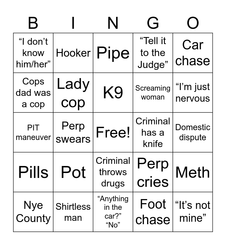 This bingo card has a free space and 24 words: Pot, Shirtless man, K9, Nye County, Car chase, “I don’t know him/her”, Cops dad was a cop, Hooker, Criminal has a knife, Criminal throws drugs, Screaming woman, PIT maneuver, Perp cries, Meth, Lady cop, Foot chase, Domestic dispute, Pipe, “I’m just nervous, Perp swears, “It’s not mine”, Pills, “Tell it to the Judge” and “Anything in the car?” “No”.