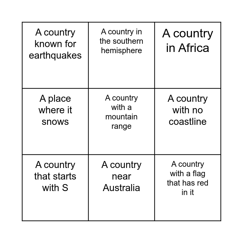 This bingo card has 9 words: A country that starts with S, A country in Africa, A country in the southern hemisphere, A place where it snows, A country known for earthquakes, A country with no coastline, A country with a mountain range, A country with a flag that has red in it and A country near Australia.