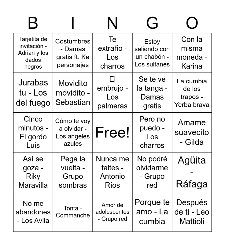 This bingo card has a free space and 75 words: Querida - Tambo Tambo, Tramposa y mentirosa - Leo Mattioli, Te extraño - Los charros, Te vas a arrepentir - La nueva luna, Una cerveza - Ráfaga, Mujer cosmica - Siete lunas, Se parece más a ti - Jambao, Una calle nos separa - Nestor en bloque, No te creas tan importante - Damas gratis, Deja de llorar - El Polaco, Lo mejor del amor - Rodrigo, Amores como el nuestro - Los charros, El embrujo - Los palmeras, Jurabas tu - Los del fuego, La cabaña - La k'onga, Cómo te voy a olvidar - Los angeles azules, Que bonito - Banda XXI, Después de ti - Leo Mattioli, Yo tomo licor - Amar Azul, Con la misma moneda - Karina, Llora me llama - Grupo play, Cinco minutos - El gordo Luis, Movidito movidito - Sebastian, Costumbres - Damas gratis ft. Ke personajes, Estoy saliendo con un chabón - Los sultanes, Podeme la luna - Re piola, Yo no sé mañana - Jambao, Cariño - La banda de lechuga, Cómo, dónde, cuándo - Sebastian, Pibe cantina - Yerba brava, Noche loca - Marama ft. Rombai, La ventanita - grupo sombras, Olvidala - Banda XXI, No podré olvidarme - Grupo red, La cumbia de los trapos - Yerba brava, Se te ve la tanga - Damas gratis, Dime si eres feliz - Hernan y la Champion's liga, Me enamoré - Agrupación Marilyn, Amame suavecito - Gilda, Porque te amo - La cumbia, Violeta - Alcides, Llegó tu papi - Sabroso, Ahora mírame - Ulises Bueno, Panic show - Los lirios, Loco corazón - Siete unas, Rosa púrpura - Siete lunas, No me abandones - Los Avila, Tarjetita de invitación - Adrian y los dados negros, Te vas - Americo, Pasito tun tun - Los chicos de la vía, Fuego y pasión - Rodrigo, Nunca me faltes - Antonio Ríos, Vete de mi lado - Los Chakales, Por lo que yo te quiero - Walter Olmos, En septiembre tu fuiste mía - Miguel Alejandro, Asado y fernet - Los caligaris, Vamos a bailar - Yerba brava, Por eso vivo - Los moykano's, Lavate la cara - Mr. Gato, Te amo - Los dora2, Pega la vuelta - Grupo sombras, Voy a olvidarme de mi - Mario Luis, Inocente - La Delio Valdez, Amiga traidora - Angela Leiva, Boquita perfumada - Sexteto imperial, Pero no puedo - Los charros, Loquito por ti - Mario Luis, Que tendrá el petiso - Ricky Maravilla, Camarón - Riki Maravilla, Agüita - Ráfaga, Así se goza - Riky Maravilla, Tonta - Commanche, Que bello - Lia Crucet, Amor de adolescentes - Grupo red and yo soy tu maestro - Roman El original.