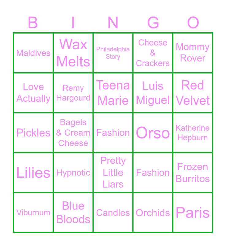 This bingo card has a free space and 24 words: Hypnotic, Blue Bloods, Teena Marie, Viburnum, Mommy Rover, Maldives, Love Actually, Wax Melts, Orso, Pretty Little Liars, Luis Miguel, Pickles, Fashion, Frozen Burritos, Remy Hargourd, Orchids, Katherine Hepburn, Philadelphia Story, Red Velvet, Bagels & Cream Cheese, Paris, Lilies, Cheese & Crackers and Candles.