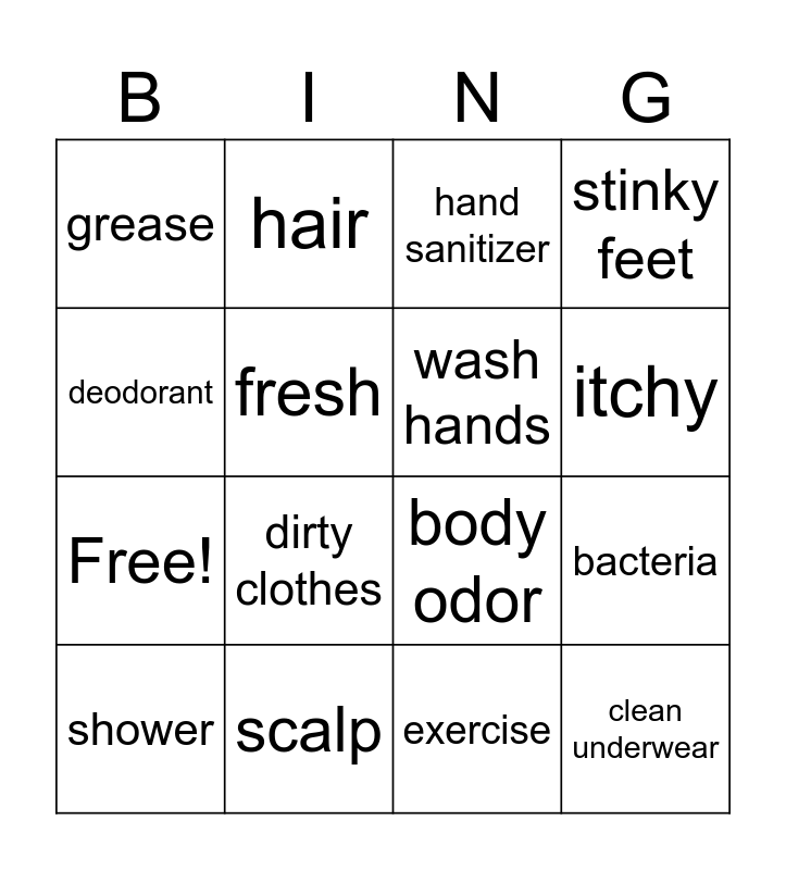 This bingo card has 20 words: bacteria, Warm water & soap, hand sanitizer, sweat, shower, deodorant, scalp, grease, Free!, hair, dirty clothes, body odor, fresh, clean underwear, wash hands, clean, itchy, stinky feet, exercise and antiperspirant.