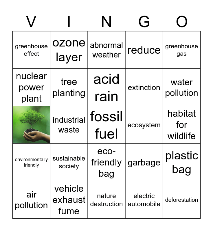 This bingo card has 1 images, a free space and 23 words: sustainable society, vehicle exhaust fume, acid rain, air pollution, greenhouse gas, greenhouse effect, nuclear power plant, ozone layer, ecosystem, eco-friendly bag, extinction, garbage, plastic bag, tree planting, electric automobile, habitat for wildlife, abnormal weather, water pollution, industrial waste, deforestation, environmentally friendly, reduce and nature destruction.