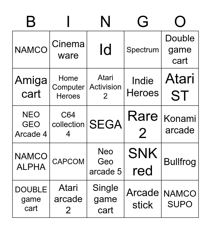 This bingo card has a free space and 24 words: CAPCOM, Atari arcade 2, Atari Activision 2, DOUBLE game cart, Double game cart, NAMCO, Amiga cart, Cinema ware, Rare 2, Neo Geo arcade 5, Indie Heroes, NEO GEO Arcade 4, SNK red, Bullfrog, Home Computer Heroes, Arcade stick, Konami arcade, Id, Atari ST, C64 collection 4, NAMCO SUPO, NAMCO ALPHA, Spectrum and Single game cart.