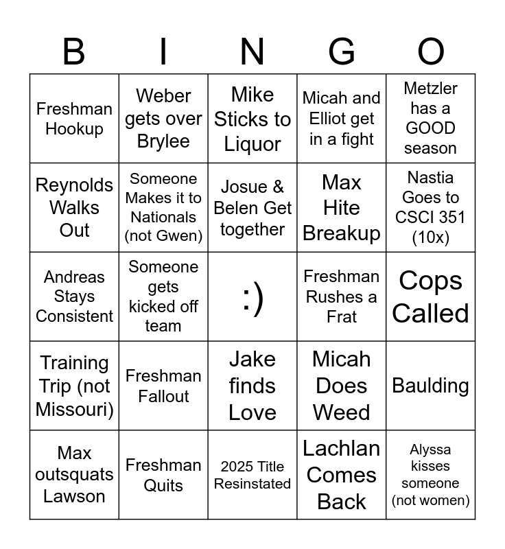 This bingo card has a free space and 24 words: Freshman Fallout, Freshman Quits, Josue & Belen Get together, Max outsquats Lawson, Metzler has a GOOD season, Freshman Hookup, Reynolds Walks Out, Weber gets over Brylee, Freshman Rushes a Frat, Jake finds Love, Max Hite Breakup, Andreas Stays Consistent, Micah Does Weed, Baulding, Someone Makes it to Nationals (not Gwen), Lachlan Comes Back, Cops Called, Mike Sticks to Liquor, Nastia Goes to CSCI 351 (10x), Someone gets kicked off team, Alyssa kisses someone (not women), Training Trip (not Missouri), Micah and Elliot get in a fight and 2025 Title Resinstated.