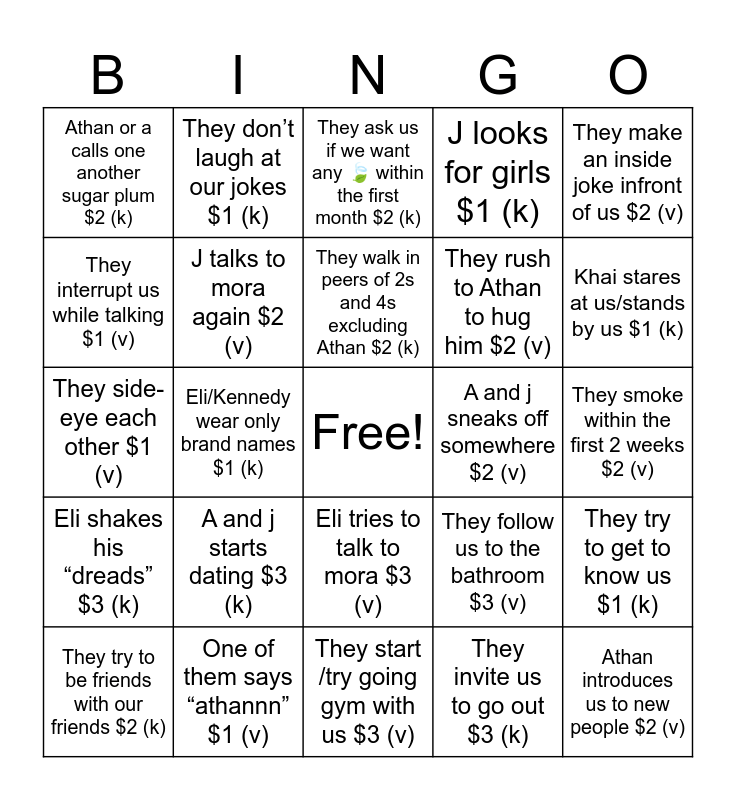 This bingo card has a free space and 24 words: A and j starts dating $3 (k), One of them says “athannn” $1 (v), They walk in peers of 2s and 4s excluding Athan $2 (k), They try to be friends with our friends $2 (k), They make an inside joke infront of us $2 (v), Athan or a calls one another sugar plum $2 (k), They interrupt us while talking $1 (v), They don’t laugh at our jokes $1 (k), A and j sneaks off somewhere $2 (v), Eli tries to talk to mora $3 (v), They rush to Athan to hug him $2 (v), They side-eye each other $1 (v), They follow us to the bathroom $3 (v), They try to get to know us $1 (k), J talks to mora again $2 (v), They invite us to go out $3 (k), They smoke within the first 2 weeks $2 (v), They ask us if we want any 🍃 within the first month $2 (k), Khai stares at us/stands by us $1 (k), Eli/Kennedy wear only brand names $1 (k), Athan introduces us to new people $2 (v), Eli shakes his “dreads” $3 (k), J looks for girls $1 (k) and They start /try going gym with us $3 (v).