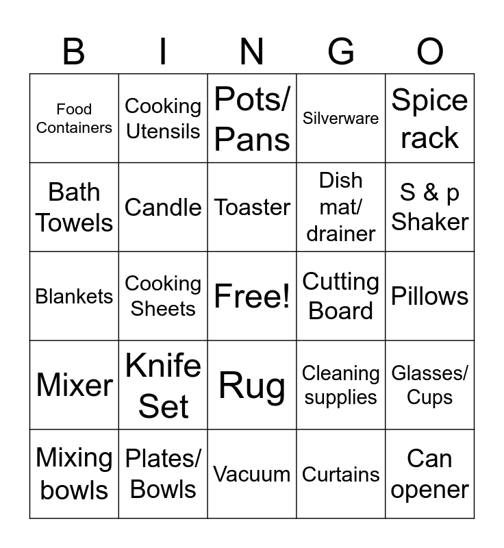 This bingo card has a free space and 24 words: Knife Set, Plates/ Bowls, Toaster, Mixing bowls, Spice rack, Food Containers, Bath Towels, Cooking Utensils, Cutting Board, Rug, Dish mat/ drainer, Blankets, Cleaning supplies, Glasses/ Cups, Candle, Curtains, Pillows, Pots/ Pans, S & p Shaker, Cooking Sheets, Can opener, Mixer, Silverware and Vacuum.