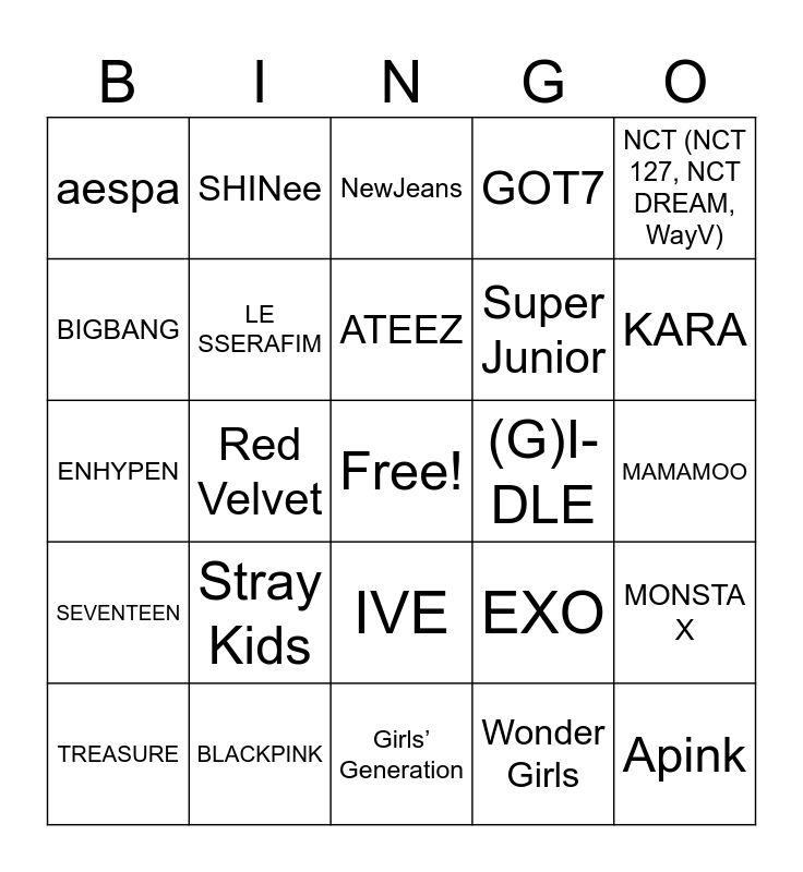 This bingo card has a free space and 30 words: BLACKPINK, TWICE, Red Velvet, ITZY, aespa, NewJeans, LE SSERAFIM, IVE, (G)I-DLE, Girls’ Generation, MAMAMOO, Apink, Wonder Girls, 2NE1, KARA, BTS, EXO, SEVENTEEN, Stray Kids, NCT (NCT 127, NCT DREAM, WayV), ENHYPEN, TXT (Tomorrow X Together), SHINee, Super Junior, BIGBANG, GOT7, MONSTA X, TREASURE, ATEEZ and iKON.