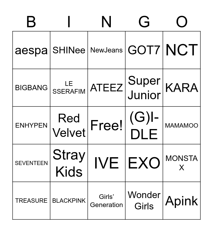 This bingo card has a free space and 30 words: BLACKPINK, TWICE, Red Velvet, ITZY, aespa, NewJeans, LE SSERAFIM, IVE, (G)I-DLE, Girls’ Generation, MAMAMOO, Apink, Wonder Girls, 2NE1, KARA, BTS, EXO, SEVENTEEN, Stray Kids, NCT, ENHYPEN, TXT, SHINee, Super Junior, BIGBANG, GOT7, MONSTA X, TREASURE, ATEEZ and iKON.