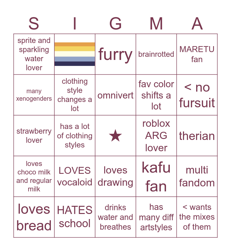 This bingo card has 1 images, a free space and 23 words: LOVES vocaloid, HATES school, omnivert, loves bread, MARETU fan, sprite and sparkling water lover, many xenogenders, roblox ARG lover, loves drawing, fav color shifts a lot, strawberry lover, kafu fan, multi fandom, clothing style changes a lot, has many diff artstyles, therian, furry, < no fursuit, has a lot of clothing styles, < wants the mixes of them, loves choco milk and regular milk, brainrotted and drinks water and breathes.