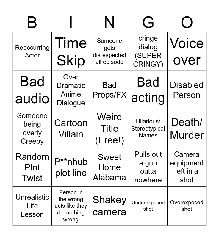 This bingo card has a free space and 33 words: Taboo, Unnecessary Kissing, Cartoon Villain, Racism, Random Plot Twist, Over Dramatic Anime Dialogue, Voice over, Unrealistic Life Lesson, Time Skip, Offensive for no reason, Bad Props/FX, Someone gets disrespected all episode, Supernatural Occurence, Plot Armor, Hilarious/ Stereotypical Names, Disabled Person, Person in the wrong acts like they did nothing wrong, Someone being overly Creepy, P**nhub plot line, Pulls out a gun outta nowhere, Sweet Home Alabama, Cheating, Reoccurring Actor, Death/ Murder, Shakey camera, Overexposed shot, cringe dialog (SUPER CRINGY), Bad acting, Bad audio, Camera equipment left in a shot, a situation nobody could get into, Underexposed shot and recurring set.