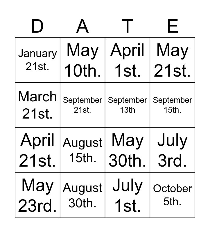This bingo card has 32 words: September 3rd., October 15th., July 3rd., July 13th., October 5th., September 13th, March 21st., January 1st., May 10th., September 6th., September 15th., April 1st., December 9th., August 13th., August 30th., September 30th., July 30th., May 30th., May 13th., August 3rd., August 1st., September 1st., July 1st., September 23rd., May 23rd., May 21st., April 21st., September 21st., January 21st., February 21st., December 21st. and August 15th..