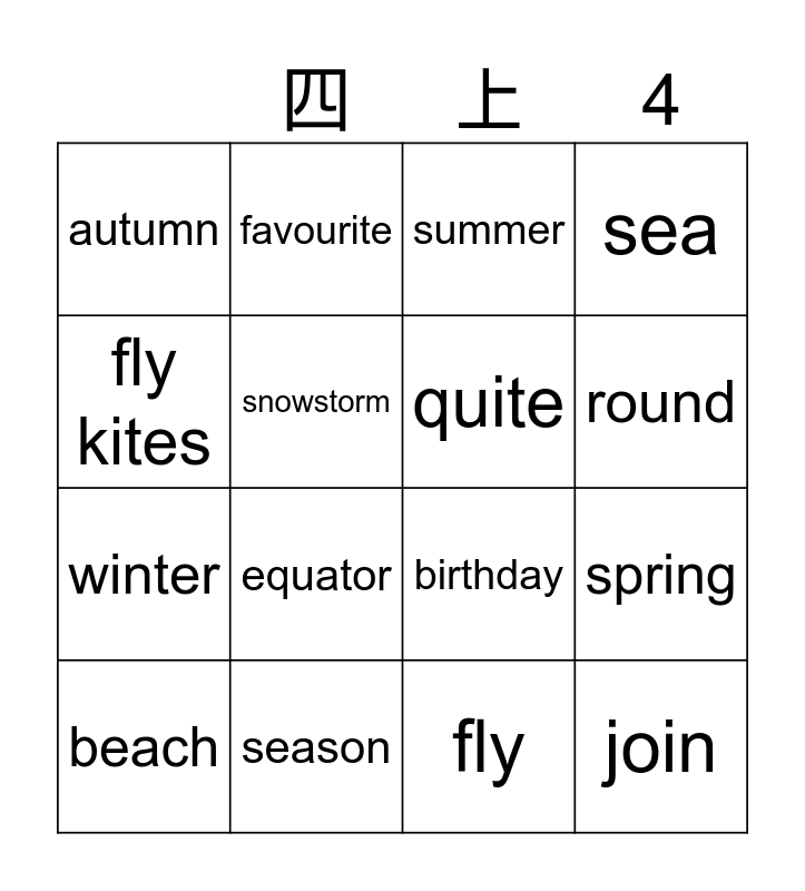This bingo card has 16 words: season, spring, summer, autumn, winter, favourite, birthday, fly, fly kites, snowstorm, beach, sea, equator, round, quite and join.