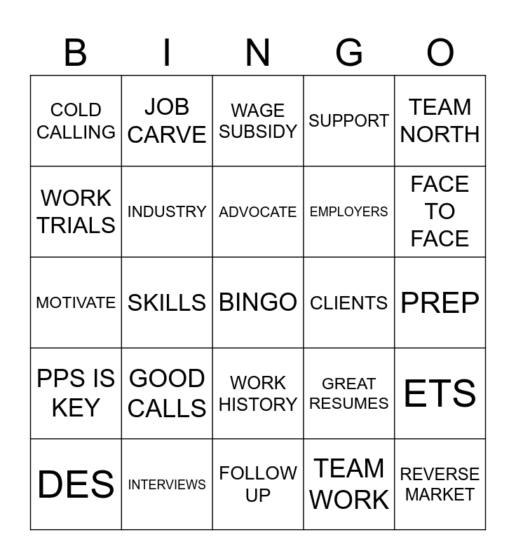 This bingo card has a free space and 24 words: GOOD CALLS, INTERVIEWS, ADVOCATE, DES, TEAM NORTH, COLD CALLING, WORK TRIALS, JOB CARVE, CLIENTS, WORK HISTORY, EMPLOYERS, MOTIVATE, GREAT RESUMES, ETS, INDUSTRY, TEAM WORK, PREP, WAGE SUBSIDY, FACE TO FACE, SKILLS, REVERSE MARKET, PPS IS KEY, SUPPORT and FOLLOW UP.