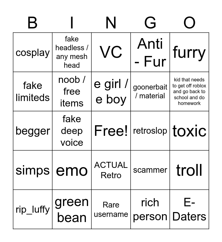 This bingo card has a free space and 24 words: emo, green bean, e girl / e boy, rip_luffy, furry, cosplay, fake limiteds, fake headless / any mesh head, retroslop, ACTUAL Retro, goonerbait / material, begger, scammer, troll, noob / free items, rich person, toxic, VC, kid that needs to get off roblox and go back to school and do homework, fake deep voice, E- Daters, simps, Anti - Fur and Rare username.