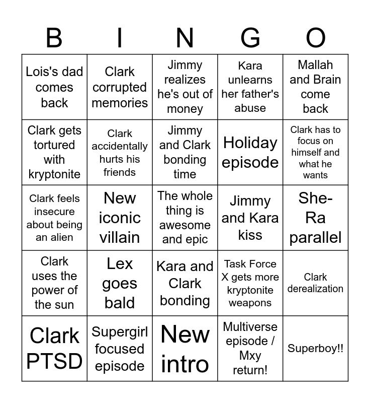 This bingo card has a free space and 24 words: Lex goes bald, Supergirl focused episode, Jimmy and Clark bonding time, Clark PTSD, Mallah and Brain come back, Lois's dad comes back, Clark gets tortured with kryptonite, Clark corrupted memories, Jimmy and Kara kiss, Kara and Clark bonding, Holiday episode, Clark feels insecure about being an alien, Task Force X gets more kryptonite weapons, Clark derealization, Clark accidentally hurts his friends, Multiverse episode / Mxy return!, She-Ra parallel, Jimmy realizes he's out of money, Clark has to focus on himself and what he wants, New iconic villain, Superboy!!, Clark uses the power of the sun, Kara unlearns her father's abuse and New intro.