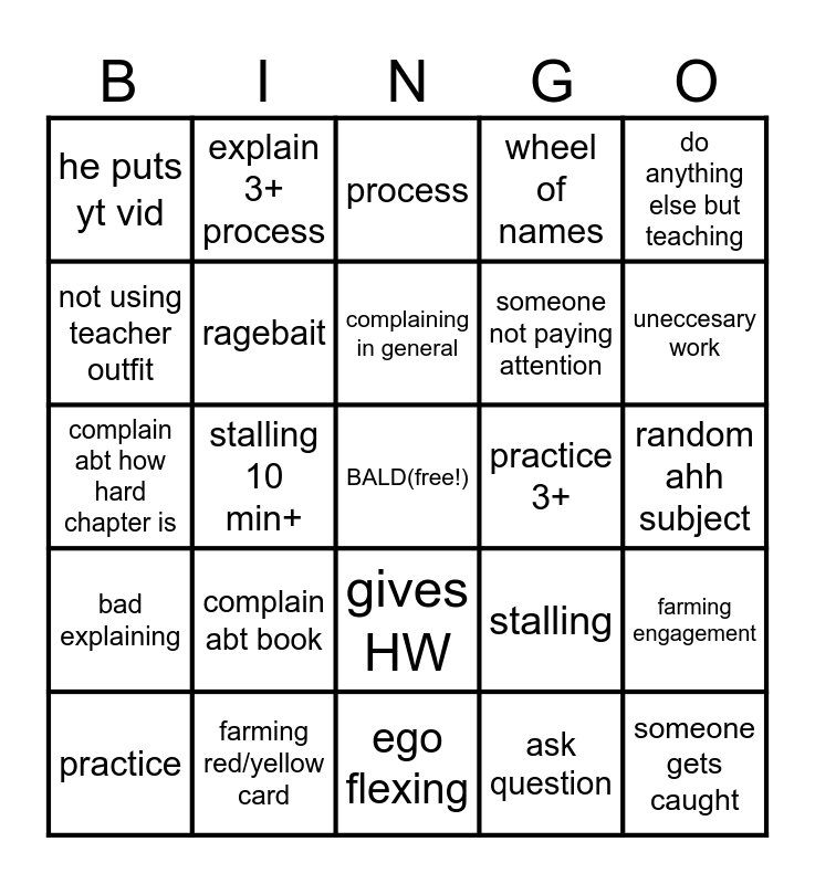 This bingo card has a free space and 24 words: practice, complain abt book, complaining in general, ask question, do anything else but teaching, he puts yt vid, explain 3+ process, process, practice 3+, random ahh subject, complain abt how hard chapter is, ragebait, stalling, farming engagement, not using teacher outfit, farming red/yellow card, ego flexing, wheel of names, uneccesary work, bad explaining, stalling 10 min+, gives HW, someone not paying attention and someone gets caught.