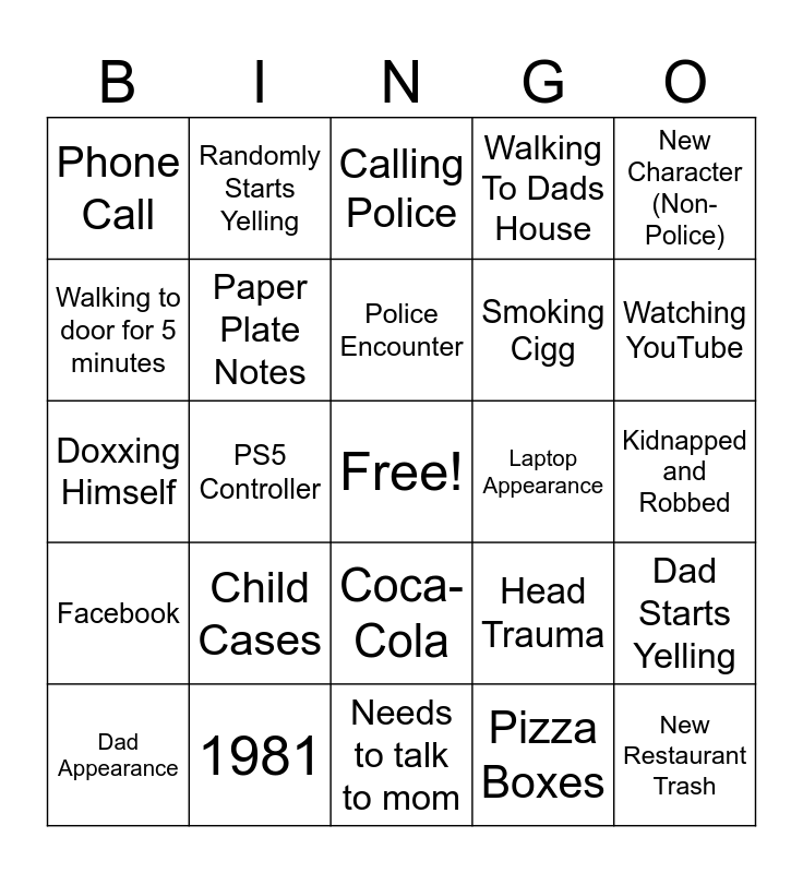 This bingo card has a free space and 24 words: Child Cases, 1981, Police Encounter, Dad Appearance, New Character (Non-Police), Phone Call, Walking to door for 5 minutes, Randomly Starts Yelling, Laptop Appearance, Coca-Cola, Smoking Cigg, Doxxing Himself, Head Trauma, Dad Starts Yelling, Paper Plate Notes, Pizza Boxes, Kidnapped and Robbed, Calling Police, Watching YouTube, PS5 Controller, New Restaurant Trash, Facebook, Walking To Dads House and Needs to talk to mom.