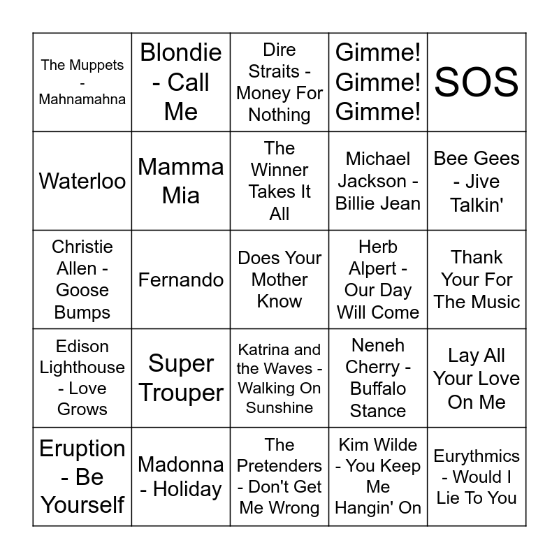 This bingo card has 37 words: Dancing Queen, Knowing Me, Knowing You, Take A Chance On Me, Mamma Mia, Lay All Your Love On Me, Super Trouper, The Winner Takes It All, Money, Money, Money, SOS, Chiquitita, Fernando, Gimme! Gimme! Gimme!, Does Your Mother Know, Thank Your For The Music, Waterloo, Edison Lighthouse - Love Grows, Diana Ross - Chain Reaction, Dire Straits - Money For Nothing, Katrina and the Waves - Walking On Sunshine, Herb Alpert - Our Day Will Come, The Muppets - Mahnamahna, Bee Gees - Jive Talkin', Eruption - Be Yourself, The Pretenders - Don't Get Me Wrong, Emotions - Best of My Love, Kim Wilde - You Keep Me Hangin' On, Blondie - Call Me, Berlin - No More Words, Til Tuesday - Love in a Vacuum, George Michael - Freedom!, Deee-lite - What Is Love?, Madonna - Holiday, Christie Allen - Goose Bumps, Eurythmics - Would I Lie To You, Neneh Cherry - Buffalo Stance, Michael Jackson - Billie Jean and Lipps Inc - Funkytown.