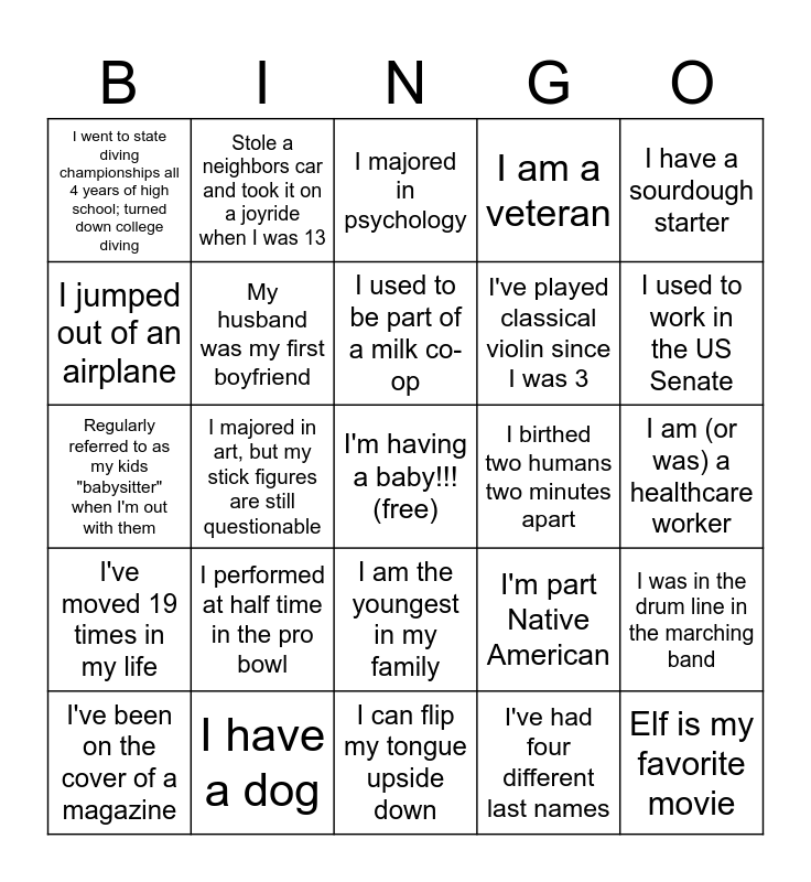 This bingo card has a free space and 24 words: I performed at half time in the pro bowl, I have a dog, I used to be part of a milk co-op, I've been on the cover of a magazine, I have a sourdough starter, I went to state diving championships all 4 years of high school; turned down college diving, I jumped out of an airplane, Stole a neighbors car and took it on a joyride when I was 13, I birthed two humans two minutes apart, I am the youngest in my family, I've played classical violin since I was 3, Regularly referred to as my kids "babysitter" when I'm out with them, I'm part Native American, I was in the drum line in the marching band, My husband was my first boyfriend, I've had four different last names, I am (or was) a healthcare worker, I majored in psychology, I used to work in the US Senate, I majored in art, but my stick figures are still questionable, Elf is my favorite movie, I've moved 19 times in my life, I am a veteran and I can flip my tongue upside down.