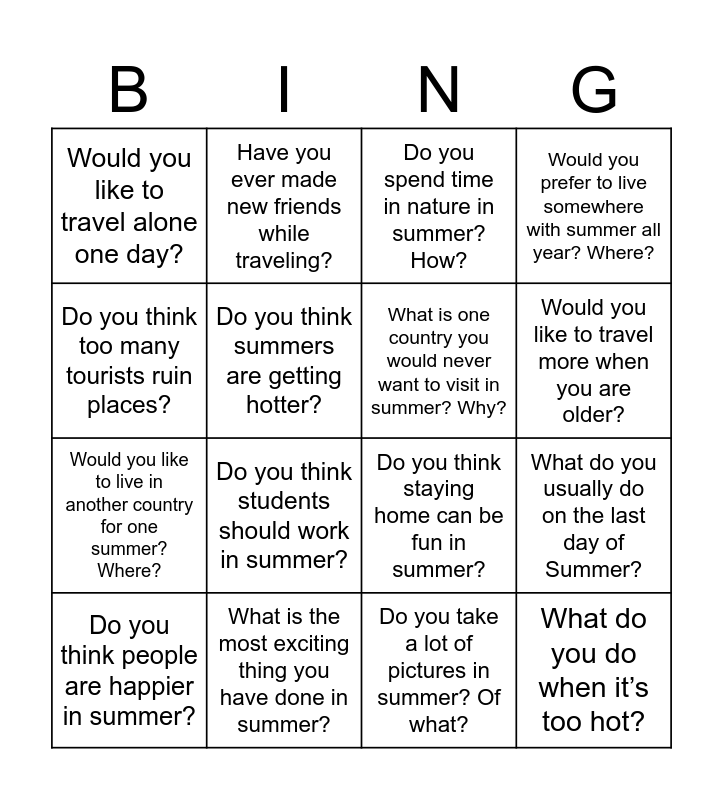 This bingo card has 16 words: What is the most exciting thing you have done in summer?, What do you usually do on the last day of Summer?, Do you spend time in nature in summer? How?, Would you like to travel alone one day?, Would you like to live in another country for one summer? Where?, Have you ever made new friends while traveling?, Do you think staying home can be fun in summer?, Do you take a lot of pictures in summer? Of what?, Do you think too many tourists ruin places?, Do you think summers are getting hotter?, Do you think people are happier in summer?, Would you prefer to live somewhere with summer all year? Where?, Do you think students should work in summer?, Would you like to travel more when you are older?, What is one country you would never want to visit in summer? Why? and What do you do when it’s too hot?.
