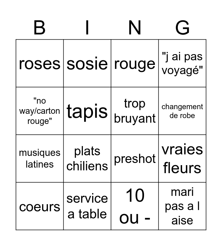 This bingo card has 16 words: service a table, vraies fleurs, rouge, roses, musiques latines, sosie, preshot, 10 ou -, "no way/carton rouge", tapis, coeurs, "j ai pas voyagé", plats chiliens, changement de robe, trop bruyant and mari pas a l aise.