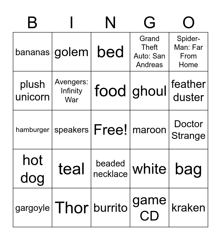 This bingo card has a free space and 24 words: teal, Thor, food, gargoyle, Spider-Man: Far From Home, bananas, plush unicorn, golem, maroon, beaded necklace, ghoul, hamburger, white, bag, Avengers: Infinity War, game CD, Doctor Strange, bed, feather duster, speakers, kraken, hot dog, Grand Theft Auto: San Andreas and burrito.