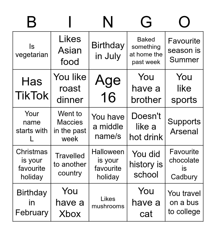 This bingo card has 25 words: Travelled to another country, Likes mushrooms, Age 16, Birthday in February, Favourite season is Summer, Is vegetarian, Has TikTok, Likes Asian food, Doesn't like a hot drink, Halloween is your favourite holiday, You have a brother, Your name starts with L, You did history is school, Favourite chocolate is Cadbury, You like roast dinner, You travel on a bus to college, Supports Arsenal, Birthday in July, You like sports, Went to Maccies in the past week, You have a middle name/s, You have a Xbox, Christmas is your favourite holiday, Baked something at home the past week and You have a cat.