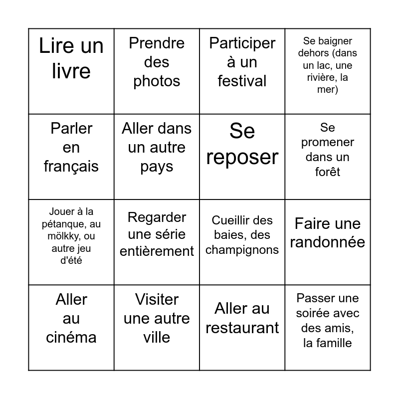 This bingo card has 16 words: Visiter une autre ville, Faire une randonnée, Participer à un festival, Lire un livre, Jouer à la pétanque, au mölkky, ou autre jeu d'été, Prendre des photos, Cueillir des baies, des champignons, Aller au restaurant, Parler en français, Aller dans un autre pays, Aller au cinéma, Se baigner dehors (dans un lac, une rivière, la mer), Regarder une série entièrement, Se promener dans un forêt, Se reposer and Passer une soirée avec des amis, la famille.
