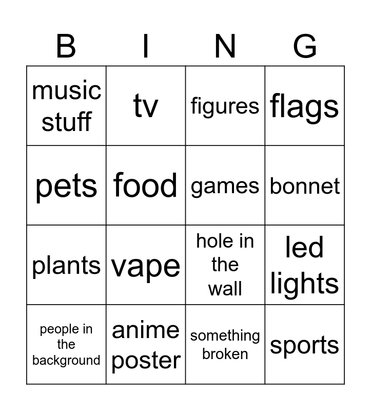 This bingo card has 16 words: anime poster, led lights, figures, music stuff, plants, tv, hole in the wall, something broken, pets, food, people in the background, flags, vape, bonnet, games and sports.