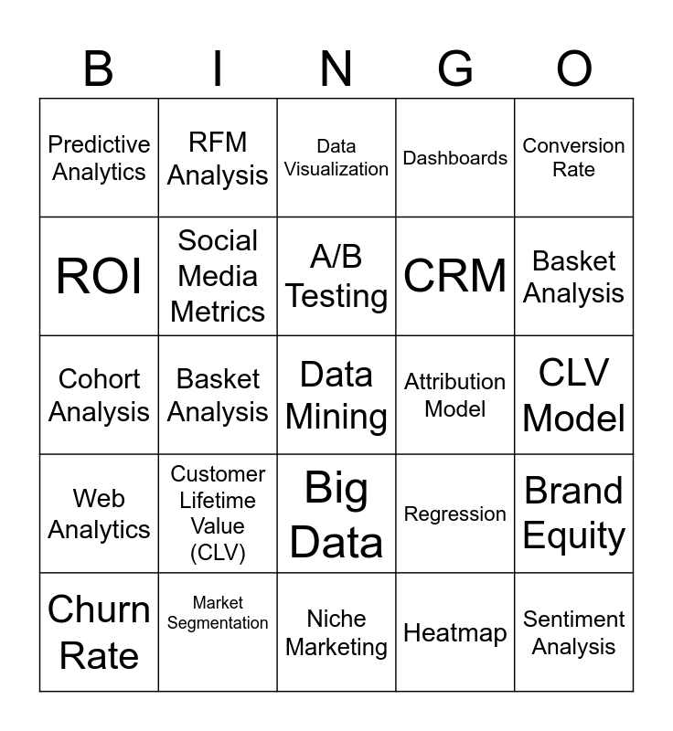 This bingo card has a free space and 24 words: Customer Lifetime Value (CLV), Market Segmentation, A/B Testing, Churn Rate, Conversion Rate, Predictive Analytics, ROI, RFM Analysis, Attribution Model, Big Data, CRM, Cohort Analysis, Regression, Brand Equity, Social Media Metrics, Heatmap, CLV Model, Data Visualization, Basket Analysis, Basket Analysis, Sentiment Analysis, Web Analytics, Dashboards and Niche Marketing.