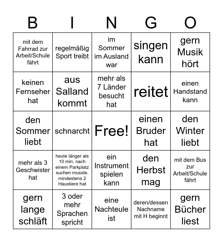 This bingo card has a free space and 57 words: Vegetarier ist, gern lange schläft, morgens Kaffee trinkt, mit dem Fahrrad zur Arbeit/Schule fährt, eine Nachteule ist, in Zwolle wohnt, aus Salland kommt, in Deventer arbeitet, reitet, Berlin liebt, singen kann, sportlich ist, ein silbernes Auto hat, eine Tochter hat, gegen Katzen allergisch ist, Fußball mag, gern Musik hört, schnarcht, ein Tattoo hat, gern Bücher liest, einen Bruder hat, im Frühling Geburtstag hat, den Herbst mag, im Sommer im Ausland war, im August im Meer gebadet hat, mehr als 7 Länder besucht hat, zu viel Netflix schaut, aus einem anderen Land kommt, einen Handstand kann, das gleiche Hobby hat wie du, schon 18 Jahre alt ist, sich auf regen freut, größer als 1,80m ist, gerne Zeltet, den Winter liebt, keinen Fernseher hat, die gleiche Augenfarbe hat wie du, den Sommer liebt, eine Fremdsprache Spricht, mehr als 3 Geschwister hat, regelmäßig Sport treibt, ein Instrument spielen kann, als Kind Gitarre gespielt hat, Linkshänder ist, im selben Monat wie du Geburtstag hat, schon einmal in einem anderen Land gelebt hat, heute länger als 10 min. nach einem Parkplatz suchen musste. mindestens 2 Haustiere hat, 3 oder mehr Sprachen spricht, Höhenangst hat, deren/dessen Vorname mit R beginnt, deren/dessen Vorname mit S beginnt, deren/dessen Nachname mit H beginnt, deren/dessen Nachname mit P beginnt, grüne Augen hat, keine Pommes mag, mit dem Bus zur Arbeit/Schule fährt and mit dem Zug zur Arbeit/Schule fährt.