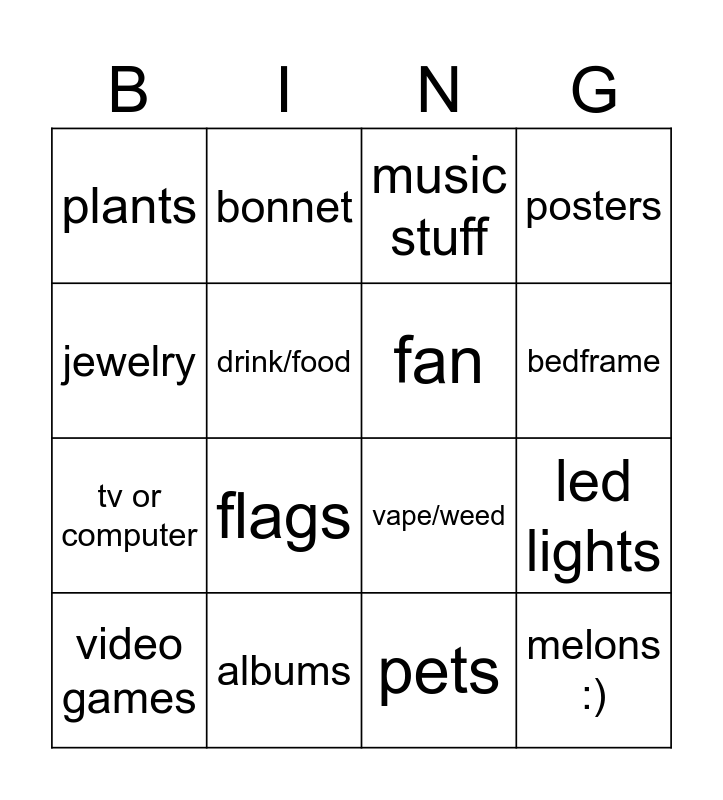 This bingo card has 16 words: albums, led lights, music stuff, plants, tv or computer, bonnet, vape/weed, pets, jewelry, drink/food, video games, posters, flags, bedframe, fan and melons :).