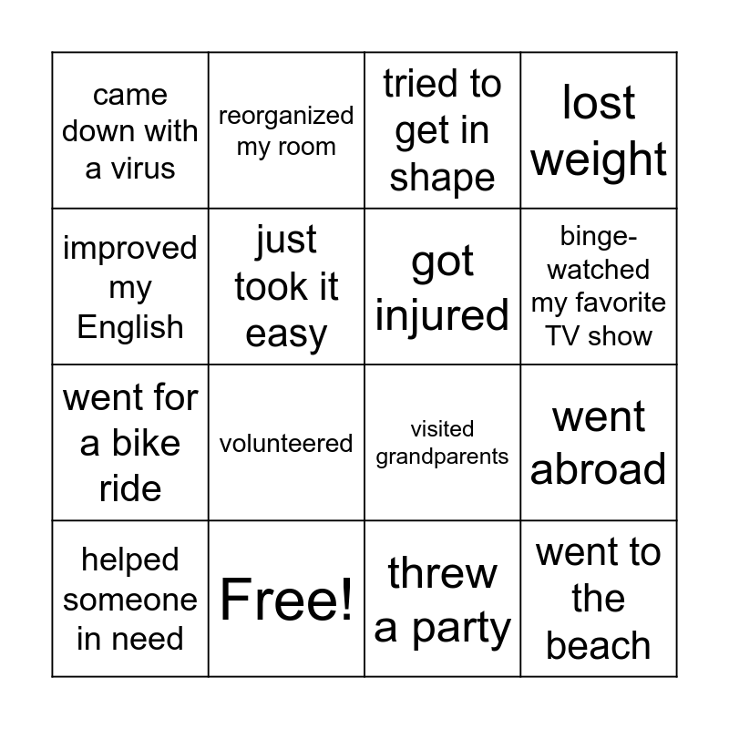 This bingo card has 21 words: Free!, tanned in the sun, reorganized my room, got a job, threw a party, got injured, came down with a virus, tried to get in shape, visited grandparents, binge-watched my favorite TV show, went for a bike ride, lost weight, went to the beach, moved to a new home, just took it easy, went on a trip, helped someone in need, volunteered, improved my English, went abroad and met someone new.