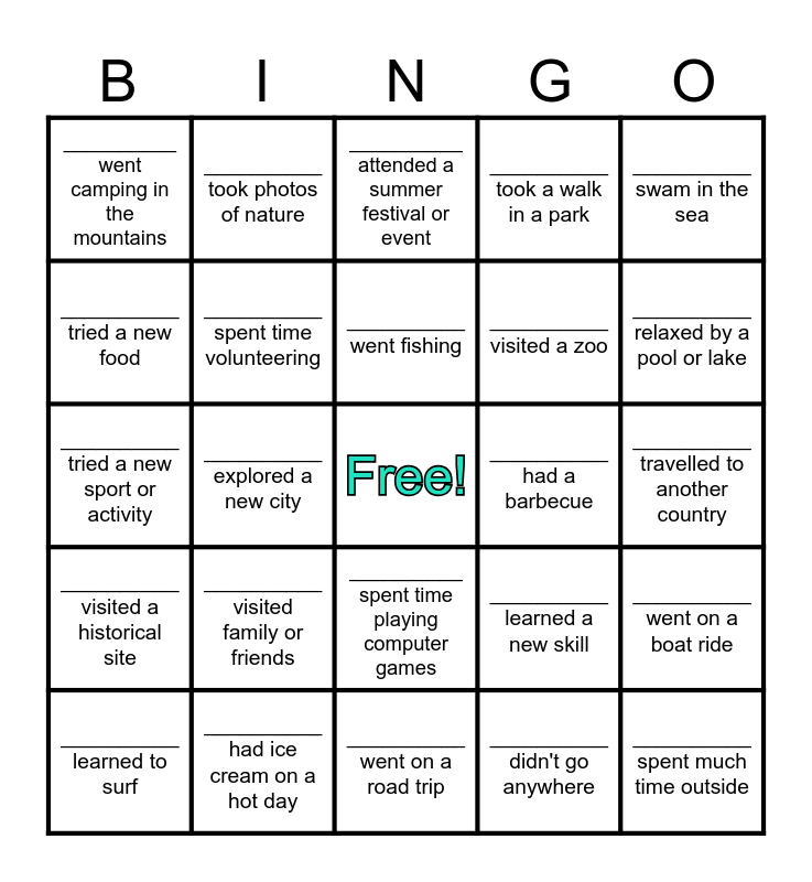 This bingo card has a free space and 24 words: __________ learned to surf, __________ visited family or friends, __________ went fishing, __________ didn't go anywhere, __________ swam in the sea, __________ went camping in the mountains, __________ took photos of nature, __________ attended a summer festival or event, __________ had a barbecue, __________ travelled to another country, __________ tried a new sport or activity, __________ spent time volunteering, __________ learned a new skill, __________ went on a boat ride, __________ tried a new food, __________ had ice cream on a hot day, __________ went on a road trip, __________ took a walk in a park, __________ relaxed by a pool or lake, __________ visited a historical site, __________ explored a new city, __________ spent time playing computer games, __________ visited a zoo and __________ spent much time outside.