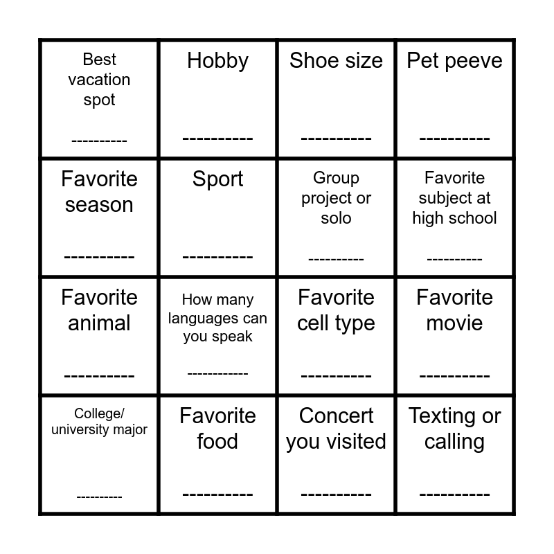 This bingo card has 16 words: Favorite food ----------, Favorite movie ----------, Shoe size ----------, Best vacation spot ----------, Favorite animal ----------, Hobby ----------, Favorite cell type ----------, Concert you visited ----------, Favorite season ----------, Sport ----------, College/ university major ----------, Pet peeve ----------, How many languages can you speak ------------, Favorite subject at high school ----------, Group project or solo ---------- and Texting or calling ----------.