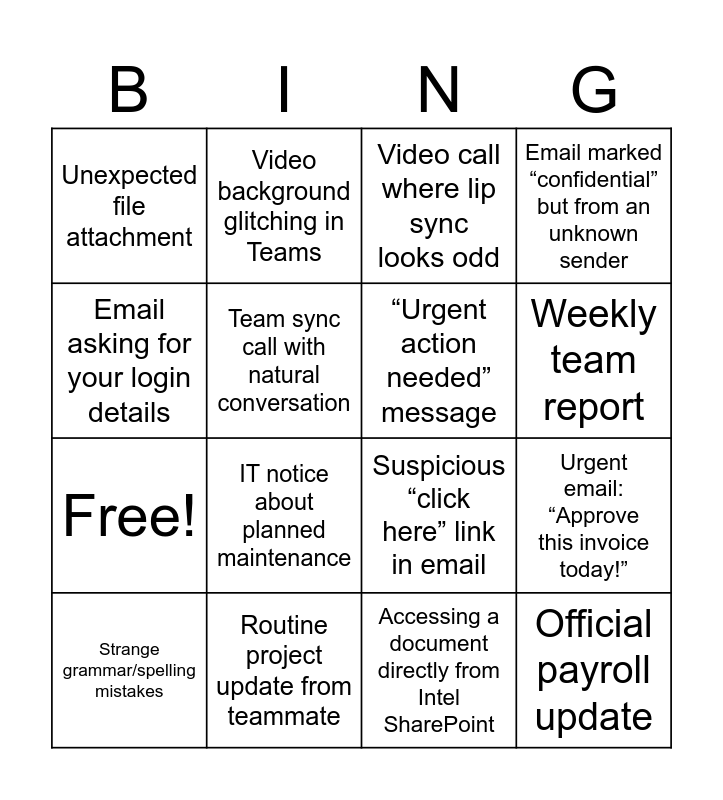 This bingo card has 20 words: Urgent email: “Approve this invoice today!”, Meeting invite from your manager, Video call where lip sync looks odd, Monthly IT newsletter, Strange grammar/spelling mistakes, Email asking for your login details, Routine project update from teammate, Unexpected file attachment, Free!, Video background glitching in Teams, IT notice about planned maintenance, Suspicious “click here” link in email, Team sync call with natural conversation, Official payroll update, “Urgent action needed” message, Emotional email claiming a colleague needs help, Weekly team report, Email marked “confidential” but from an unknown sender, Accessing a document directly from Intel SharePoint and File shared by your direct teammate via SharePoint.
