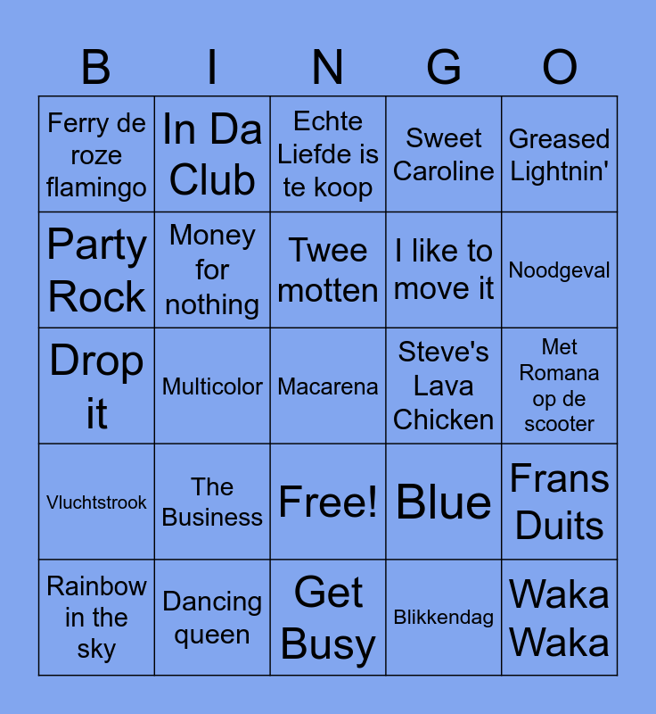 This bingo card has 45 words: Ik ga zwemmen, Macarena, Danza Kuduro, Rainbow in the sky, Satisfyer, Blikkendag, Echte Liefde is te koop, Night fever, Greased Lightnin', Dancing queen, Sweet Caroline, Steve's Lava Chicken, Free!, The Business, California Love, Get Busy, Sterrenstof, Drop it, Baila de Gasolina, Noodgeval, In Da Club, Paloma Blanca, Schudden, Ferry de roze flamingo, Love me just a litte bit more, Met Romana op de scooter, Little green bag, Krantenwijk, Blue, Vluchtstrook, What is Love, Frans Duits, Jij bent zo, Slapeloze nachten, Get lucky, Multicolor, Fireball, Terug in de tijd, Waka Waka, Twee motten, Party Rock, I like to move it, Dirty cash, Money for nothing and Baby shark.