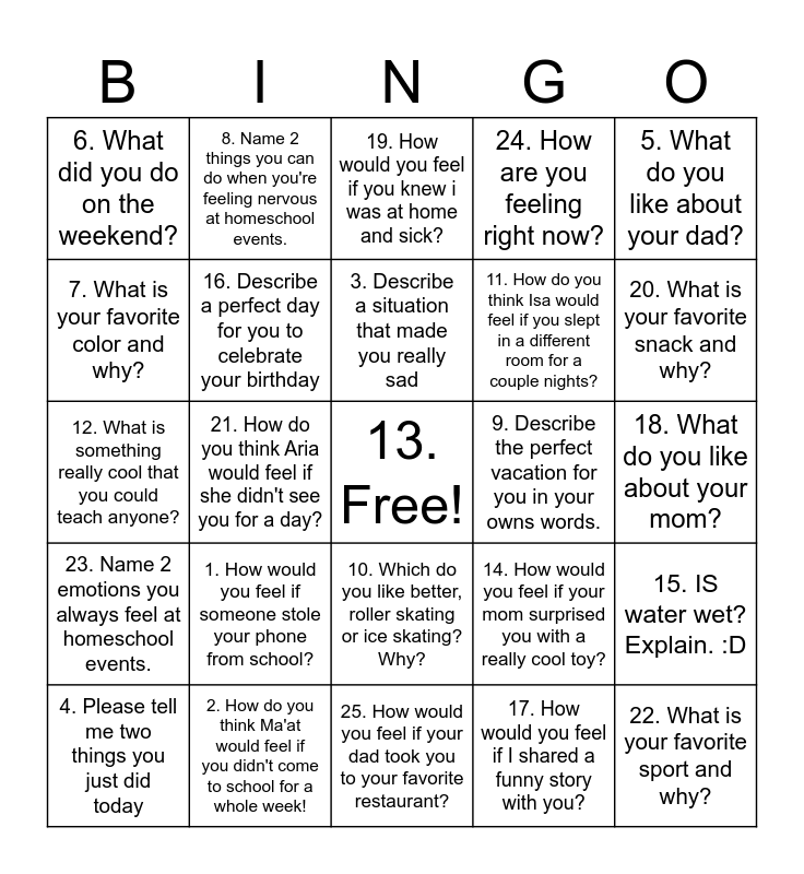This bingo card has a free space and 24 words: 1. How would you feel if someone stole your phone from school?, 2. How do you think Ma'at would feel if you didn't come to school for a whole week!, 3. Describe a situation that made you really sad, 4. Please tell me two things you just did today, 5. What do you like about your dad?, 6. What did you do on the weekend?, 7. What is your favorite color and why?, 8. Name 2 things you can do when you're feeling nervous at homeschool events., 9. Describe the perfect vacation for you in your owns words., 10. Which do you like better, roller skating or ice skating? Why?, 11. How do you think Isa would feel if you slept in a different room for a couple nights?, 12. What is something really cool that you could teach anyone?, 14. How would you feel if your mom surprised you with a really cool toy?, 15. IS water wet? Explain. :D, 16. Describe a perfect day for you to celebrate your birthday, 17. How would you feel if I shared a funny story with you?, 18. What do you like about your mom?, 19. How would you feel if you knew i was at home and sick?, 20. What is your favorite snack and why?, 21. How do you think Aria would feel if she didn't see you for a day?, 22. What is your favorite sport and why?, 23. Name 2 emotions you always feel at homeschool events., 24. How are you feeling right now? and 25. How would you feel if your dad took you to your favorite restaurant?.