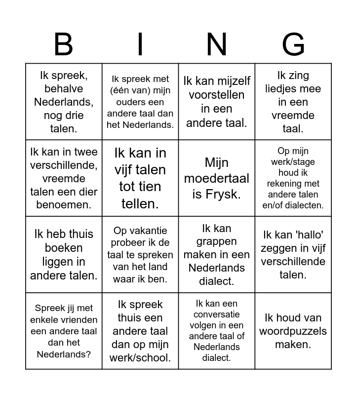 This bingo card has 16 words: Ik spreek thuis een andere taal dan op mijn werk/school., Ik kan 'hallo' zeggen in vijf verschillende talen., Ik kan mijzelf voorstellen in een andere taal., Ik spreek, behalve Nederlands, nog drie talen., Ik heb thuis boeken liggen in andere talen., Ik spreek met (één van) mijn ouders een andere taal dan het Nederlands., Ik kan grappen maken in een Nederlands dialect., Ik kan een conversatie volgen in een andere taal of Nederlands dialect., Ik kan in twee verschillende, vreemde talen een dier benoemen., Ik kan in vijf talen tot tien tellen., Spreek jij met enkele vrienden een andere taal dan het Nederlands?, Ik zing liedjes mee in een vreemde taal., Op vakantie probeer ik de taal te spreken van het land waar ik ben., Op mijn werk/stage houd ik rekening met andere talen en/of dialecten., Mijn moedertaal is Frysk. and Ik houd van woordpuzzels maken..