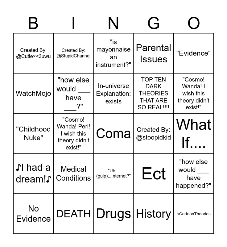 This bingo card has 25 words: Medical Conditions, Drugs, In-universe Explanation: exists, No Evidence, "Evidence", Created By: @Cutie×<3uwu, WatchMojo, Created By: @StupidChannel, Created By: @stoopidkid, "Uh...(gulp)...Internet?", TOP TEN DARK THEORIES THAT ARE SO REAL!!!!, "Childhood Nuke", Ect, "how else would ___ have happened?", "how else would ___ have ___?", r/CartoonTheories, What If...., "is mayonnaise an instrument?", "Cosmo! Wanda! I wish this theory didn't exist!", "Cosmo! Wanda! Peri! I wish this theory didn't exist!", Coma, DEATH, ♪I had a dream!♪, Parental Issues and History.