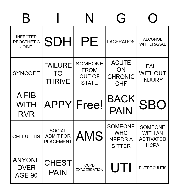 This bingo card has a free space and 29 words: ANYONE OVER AGE 90, HIP FRACTURE, APPY, CHOLE, INFECTED PROSTHETIC JOINT, PE, FAILURE TO THRIVE, SOCIAL ADMIT FOR PLACEMENT, BACK PAIN, CHEST PAIN, SBO, DIVERTICULITIS, COPD EXACERBATION, UTI, FALL WITHOUT INJURY, PNEUMONIA, AMS, CELLULITIS, ALCOHOL WITHDRAWAL, A FIB WITH RVR, SOMEONE WHO NEEDS A SITTER, ANYONE AGED 30-39, ACUTE ON CHRONIC CHF, SYNCOPE, LACERATION, SDH, SOMEONE WITH AN ACTIVATED HCPA, SOMEONE FROM OUT OF STATE and NON-ENGLISH SPEAKING.