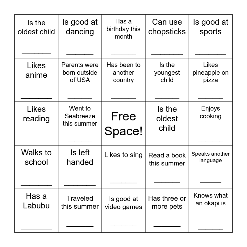 This bingo card has a free space and 24 words: Is left handed _______, Traveled this summer _______, Has been to another country _______, Has a Labubu _______, Is good at sports _______, Is the oldest child _______, Likes anime _______, Is good at dancing ______, Is the oldest child _______, Likes to sing _______, Is the youngest child _______, Likes reading _______, Read a book this summer _______, Speaks another language _______, Parents were born outside of USA _______, Has three or more pets _______, Enjoys cooking _______, Has a birthday this month _______, Likes pineapple on pizza _______, Went to Seabreeze this summer _______, Knows what an okapi is _______, Walks to school _______, Can use chopsticks _______ and Is good at video games _______.