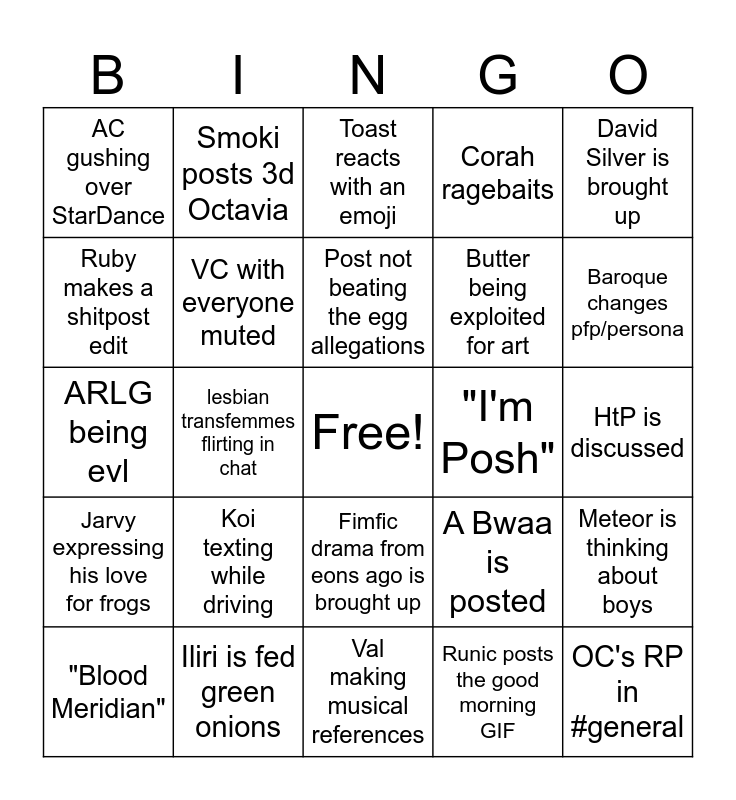 This bingo card has a free space and 24 words: Koi texting while driving, Iliri is fed green onions, Post not beating the egg allegations, "Blood Meridian", David Silver is brought up, AC gushing over StarDance, Ruby makes a shitpost edit, Smoki posts 3d Octavia, "I'm Posh", Fimfic drama from eons ago is brought up, Butter being exploited for art, ARLG being evl, A Bwaa is posted, Meteor is thinking about boys, VC with everyone muted, Runic posts the good morning GIF, HtP is discussed, Toast reacts with an emoji, Baroque changes pfp/persona, lesbian transfemmes flirting in chat, OC's RP in #general, Jarvy expressing his love for frogs, Corah ragebaits and Val making musical references.