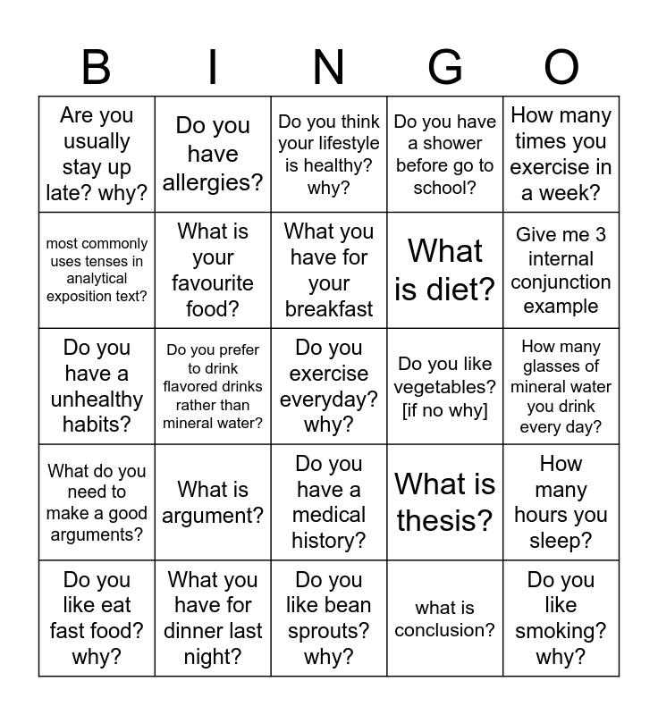 This bingo card has 25 words: What is argument?, Do you like bean sprouts? why?, What you have for your breakfast, Do you like eat fast food? why?, How many times you exercise in a week?, Are you usually stay up late? why?, most commonly uses tenses in analytical exposition text?, Do you have allergies?, Do you like vegetables? [if no why], Do you have a medical history?, What is diet?, Do you have a unhealthy habits?, What is thesis?, How many hours you sleep?, What is your favourite food?, Do you like smoking? why?, How many glasses of mineral water you drink every day?, Do you think your lifestyle is healthy? why?, Give me 3 internal conjunction example, Do you prefer to drink flavored drinks rather than mineral water?, Do you exercise everyday? why?, What you have for dinner last night?, What do you need to make a good arguments?, Do you have a shower before go to school? and what is conclusion?.