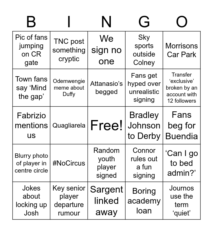 This bingo card has a free space and 24 words: #NoCircus, Key senior player departure rumour, Attanasio’s begged, Jokes about locking up Josh, Morrisons Car Park, Pic of fans jumping on CR gate, Town fans say ‘Mind the gap’, TNC post something cryptic, Bradley Johnson to Derby, Random youth player signed, Fans get hyped over unrealistic signing, Fabrizio mentions us, Connor rules out a fun signing, ‘Can I go to bed admin?’, Odemwengie meme about Duffy, Boring academy loan, Fans beg for Buendia, We sign no one, Transfer ‘exclusive’ broken by an account with 12 followers, Quagliarela, Journos use the term ‘quiet’, Blurry photo of player in centre circle, Sky sports outside Colney and Sargent linked away.