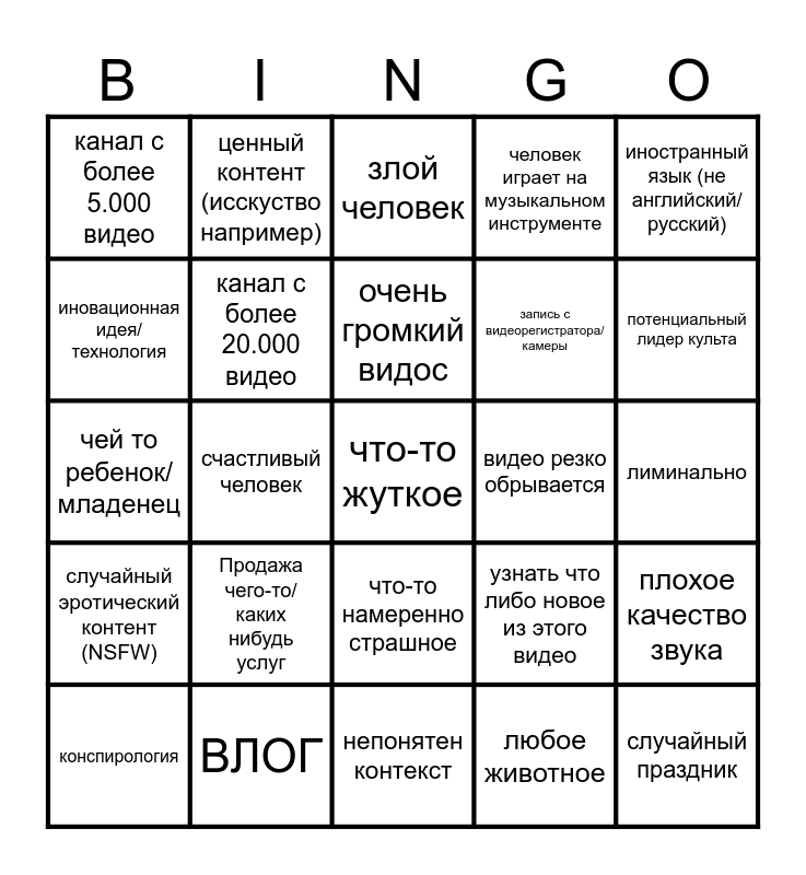 This bingo card has a free space and 24 words: Продажа чего-то/каких нибудь услуг, ВЛОГ, очень громкий видос, конспирология, иностранный язык (не английский/русский), канал с более 5.000 видео, иновационная идея/технология, ценный контент (исскуство например), видео резко обрывается, что-то намеренно страшное, запись с видеорегистратора/камеры, чей то ребенок/младенец, узнать что либо новое из этого видео, плохое качество звука, канал с более 20.000 видео, любое животное, лиминально, злой человек, потенциальный лидер культа, счастливый человек, случайный праздник, случайный эротический контент (NSFW), человек играет на музыкальном инструменте and непонятен контекст.