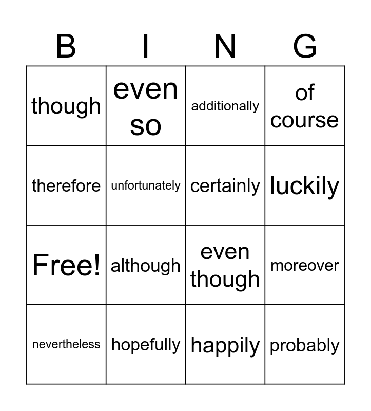 This bingo card has 20 words: moreover, furthermore, additionally, however, nevertheless, therefore, hopefully, though, Free!, even so, although, even though, unfortunately, probably, certainly, in fact, luckily, of course, happily and fortunately.