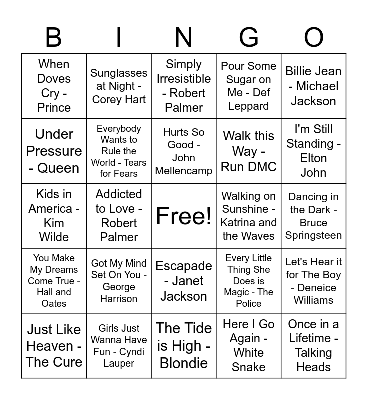 This bingo card has a free space and 51 words: Take on Me - A-Ha, Once in a Lifetime - Talking Heads, Bizarre Love Triangle - New Order, The Tide is High - Blondie, Got My Mind Set On You - George Harrison, Don't Stop Believing - Journey, Sunglasses at Night - Corey Hart, You Spin me Right Round - Dead or Alive, Under Pressure - Queen, Friday I'm in Love - The Cure, Everybody Wants to Rule the World - Tears for Fears, Pour Some Sugar on Me - Def Leppard, Let's Hear it for The Boy - Deneice Williams, Every Little Thing She Does is Magic - The Police, Money for Nothing - Dire Straights, Everywhere - Fleetwood Mac, Hurts So Good - John Mellencamp, Walking on Sunshine - Katrina and the Waves, You can Call Me Al - Paul Simon, Billie Jean - Michael Jackson, Addicted to Love - Robert Palmer, Here I Go Again - White Snake, When Doves Cry - Prince, Walk this Way - Run DMC, This Must be the Place - Talking Heads, Magic - The Cars, I'm Still Standing - Elton John, Dreams - Van Halen, Just Like Heaven - The Cure, Simply Irresistible - Robert Palmer, Don't You Want Me - The Human League, Uptown Girl - Billy Joel, Girls, Girls, Girls - Motley Crew, Danger Zone - Kenny Loggins, Upside Down - Diana Ross, Girls Just Wanna Have Fun - Cyndi Lauper, Don't you - Simple Minds, Buffalo Soldier - Bob Marley, Our House - Madness, Easy Lover - Philip Bailey, Dancing in the Dark - Bruce Springsteen, You Make My Dreams Come True - Hall and Oates, Beat It - Michael Jackson, Word Up - Cameo, Jessie's Girl - Rick Springfield, Rock the Casbah - The Clash, Kids in America - Kim Wilde, Conga - Gloria Estefan, Thriller - Michael Jackson, Escapade - Janet Jackson and Panama - Van Halen.
