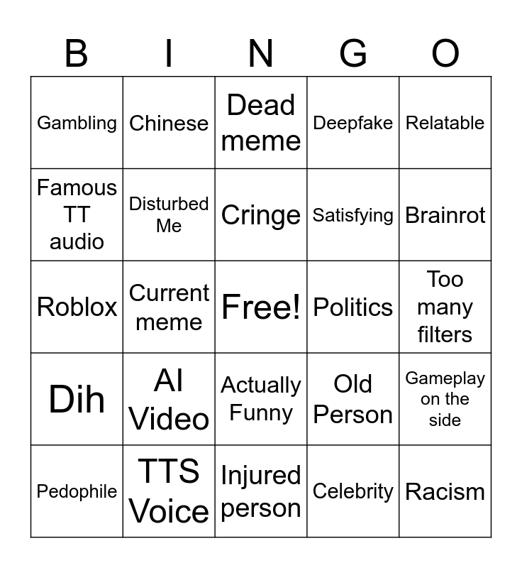This bingo card has a free space and 24 words: AI Video, TTS Voice, Cringe, Pedophile, Relatable, Gambling, Famous TT audio, Chinese, Politics, Actually Funny, Satisfying, Roblox, Old Person, Gameplay on the side, Disturbed Me, Celebrity, Too many filters, Dead meme, Brainrot, Current meme, Racism, Dih, Deepfake and Injured person.
