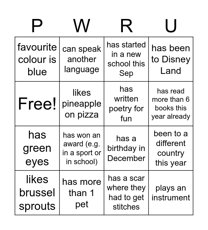 This bingo card has 16 words: has more than 1 pet, been to a different country this year, has started in a new school this Sep, favourite colour is blue, has green eyes, can speak another language, has a birthday in December, has a scar where they had to get stitches, Free!, likes pineapple on pizza, likes brussel sprouts, has been to Disney Land, has won an award (e.g. in a sport or in school), has read more than 6 books this year already, has written poetry for fun and plays an instrument.